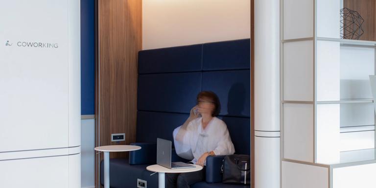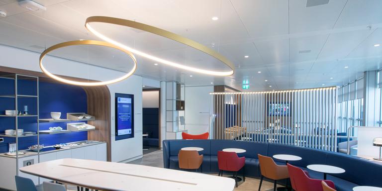 お食事、ご休憩、お仕事などができる親しみやすい新ラウンジでゆっくりお過ごしください。